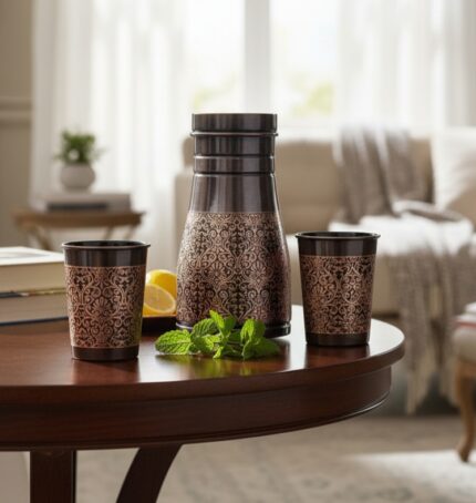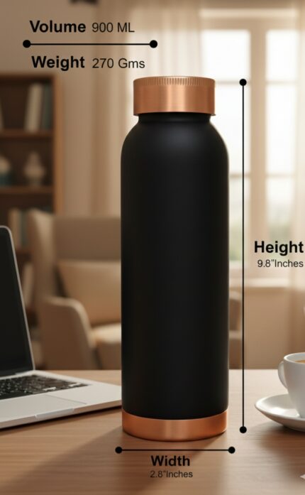Upgrade your lifestyle with this Premium Copper Silk Finish Water Bottle with Two Glass Set in Black Color from Metals Bazar. This 100% pure copper bottle is beautifully crafted with a silky smooth finish and luxurious matte black coating, giving it a modern and elegant look perfect for both home and office use.