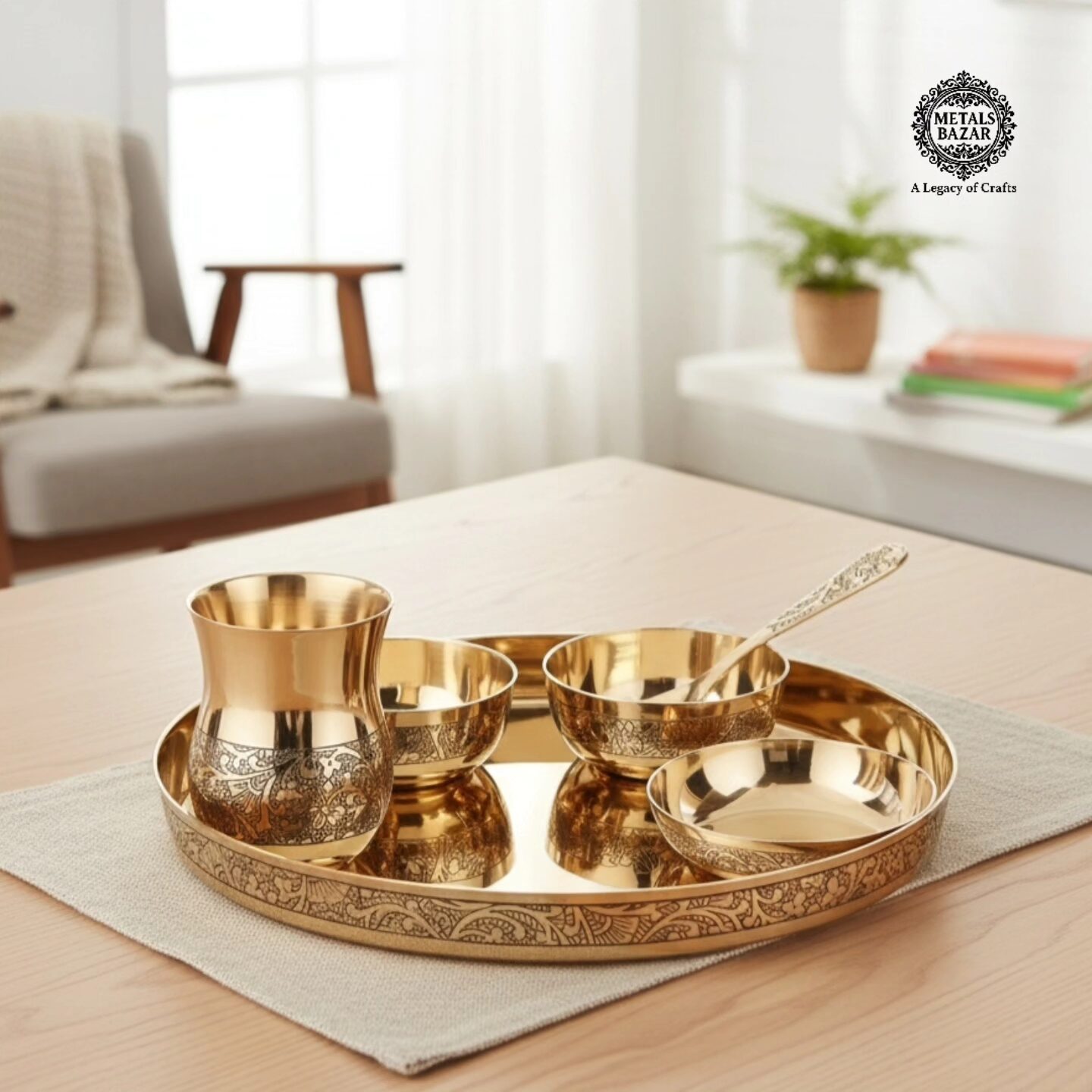 Bring home the timeless charm of traditional Indian dining with this Pure Bronze Dinner Set (6 Pieces) from Metals Bazar. Expertly handcrafted by skilled artisans, this premium bronze dinnerware set adds a royal and antique touch to your dining experience. Perfect for daily use as well as festive occasions, gifting, or temple offerings.